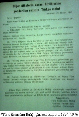 Devletler tarihinde en son kurulan Türk Devleti olarak yer alan “ Kıbrıs Türk Federe Devleti (KTFD)” kıbrıs türkleri haklarının ve güvenliklerinin yok edilmesi nedeniyle kendi kaderlerini tayin hakkına (Self-Determinasyon) dayanarak kurulmuştur. Rumlar kurulan devletin meşru haklara dayanmadığını ispatlamak amacıyla dünya kamuoyunda bir yıpratma kampanyasına başlamışlardı. Bu kampanyaya katkıda bulunmak amacıyla Rum Doktorlar ve Eczacılar Birliği 1975 yılında dış memleketlerdeki benzer meslek kuruluşlarına hitaben bir bildiri yayınlayarak kurulan devletin sınırları içersinde afyon (haşhaş) ekildiği iddiasında bulundular. Bir anlamda Akdenizde gayrimeşru işlerden nemalanan bir korsan devlet kurulduğu kanaatini dünya kamuoyuna yerleştirmek istiyorlardı. Bu gelişme karşısında Cumhurbaşkanı Rauf Denktaş Türk Eczacıları Birliği Genel Başkanı olarak bana da KTFD sınırları içersinde afyon ekimi yapılmadığını belirleyen bir yazı göndermişti. Aldığımız bu yazı üzerine Türk Eczacıları Birliği olarak dış ülkelerin Eczacı Birliklerinin tamamına gerçeği anlatan bir yazı gönderdik, konuyu katıldığımız uluslararası platformlarda dile getirdik ve basında bildiriler yayınladık.Bilindiği gibi 1983 yılında devletin adı "Kuzey Kıbrıs Türk Cumhuriyeti (KKTC)" olarak değiştirilmişti.