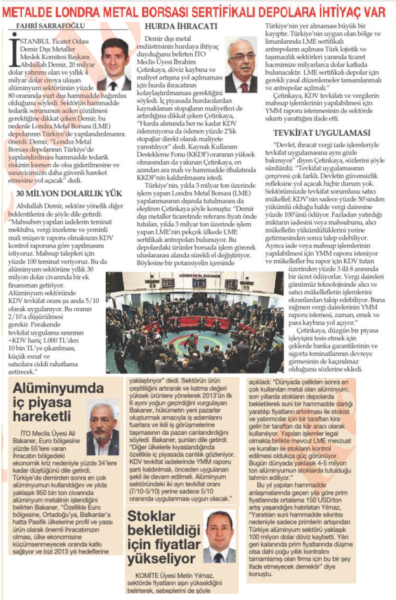 Aluminyum,bakır, çinko, nikel ticareti yapan Şirketlerin güncel sorunları İTO'nun İstanbul Ticaret Gazetesindeki haber roportajlarda dile getirildi. KDV tevkifatlarının mahsubunda YMM raporu istenmesi, tevkifatta oranların değişmesi, hurda ihracatının önlenmesi, LME antrepolarının Türkiyede açılması, çeklerde Sigorta Şirketlerinin ve Bankaların devreye alınması öne çıkan sorunlardan.